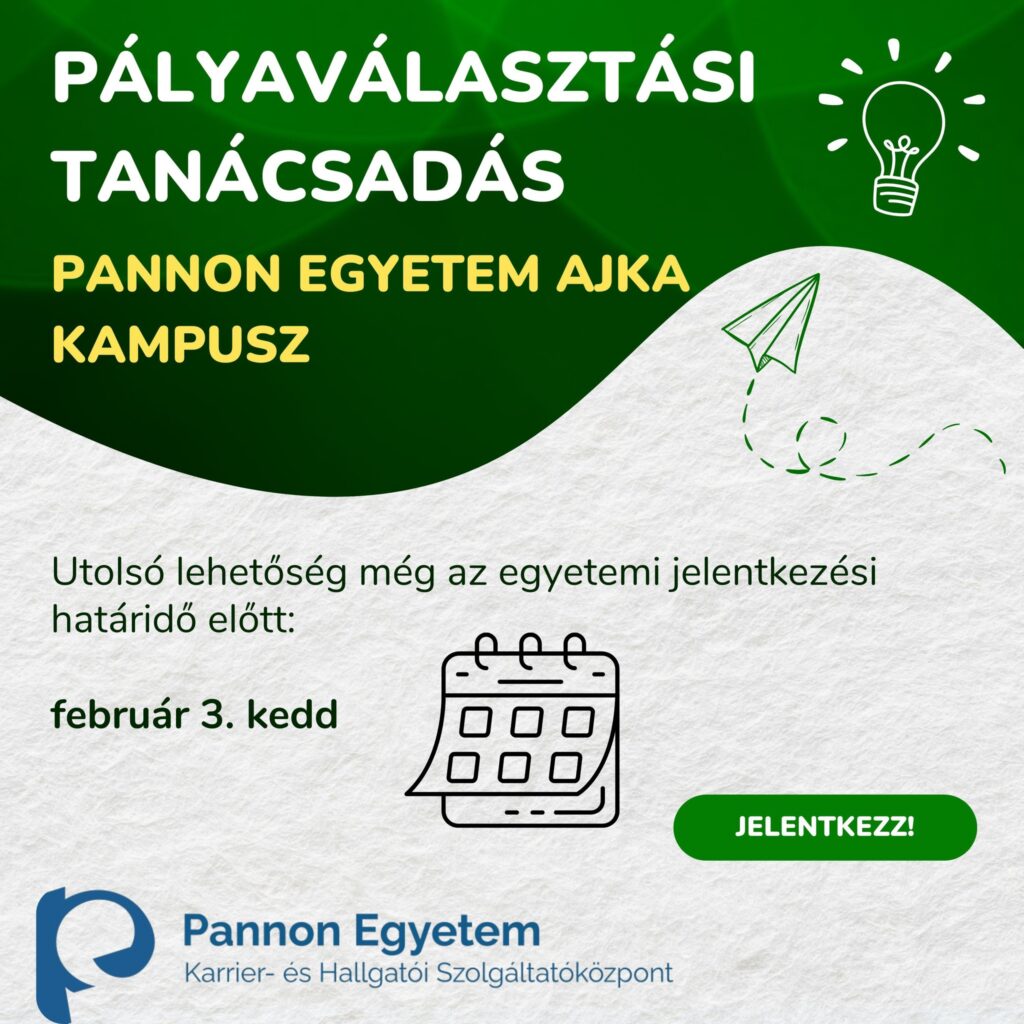 A felsőoktatási jelentkezési határidő közeledtével sok diákban merülnek fel kérdések a választott szakokkal és az intézmények sorrendjével kapcsolatban. A Pannon Egyetem Ajka Kampusz most egy utolsó, személyes konzultációs lehetőséget kínál a bizonytalan felvételizőknek. (Forrás)